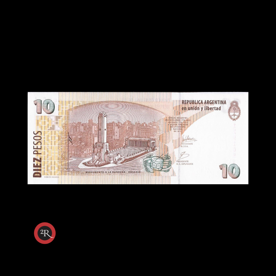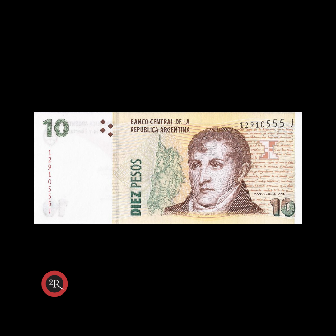 ARGENTINA 10 PESOS 2008 CONVERTIBLES 2° DISEÑO SIN LEYENDA BOT#3430 COL#779b