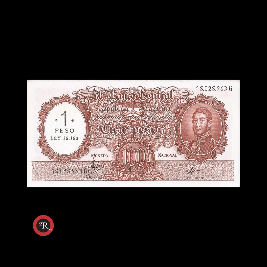 ARGENTINA 100 PESOS MONEDA NACIONAL RESELLADO A 1 PESO LEY 18188 1969 BOT#2201 COL#551a