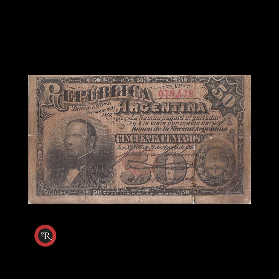 ARGENTINA 1891 50 CENTAVOS BOT#1028 COL#034 CAJA CONVERSION (FRACCIONARIOS)