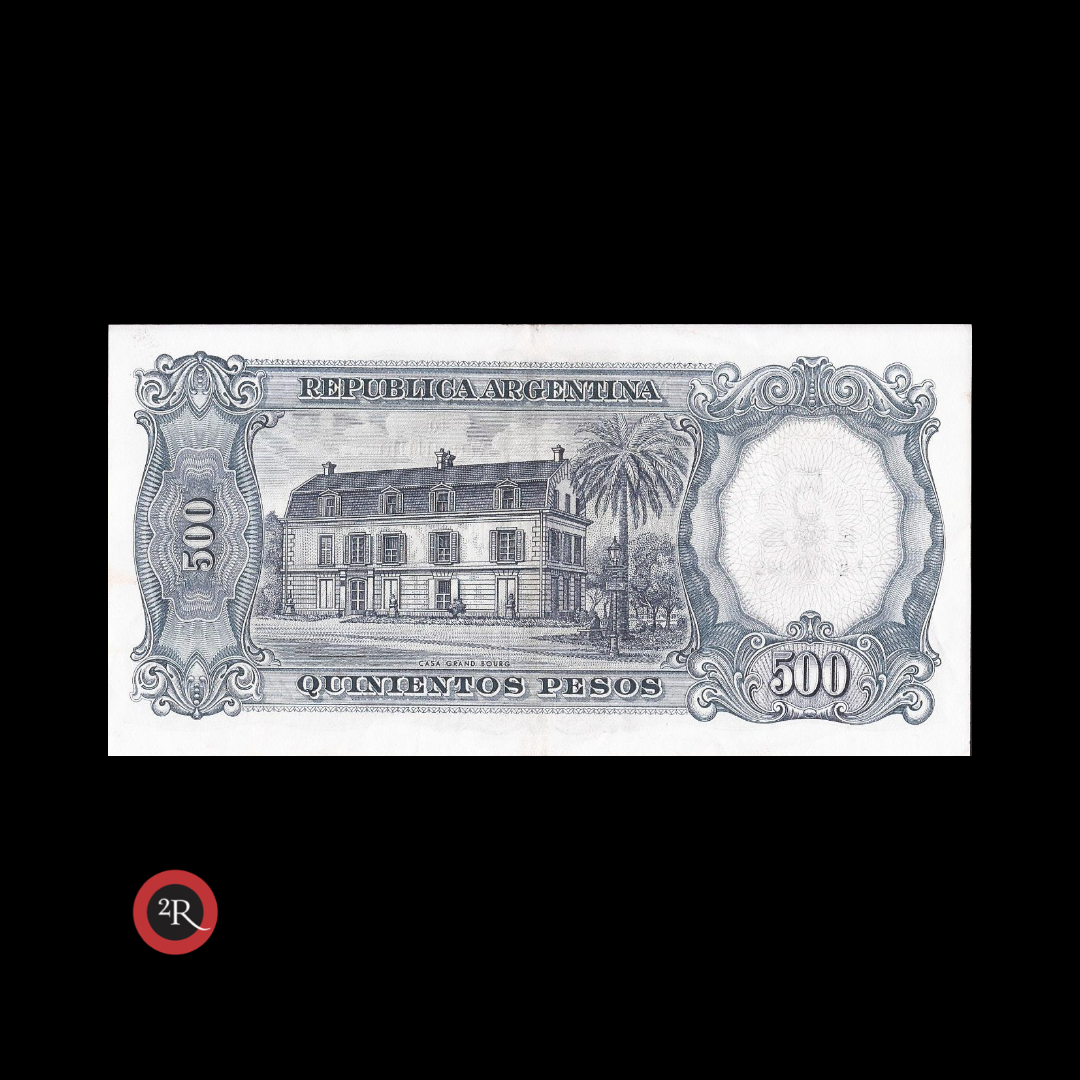 ARGENTINA 500 PESOS MONEDA NACIONAL RESELLADO A 5 PESOS LEY 18188 1969 BOT# 2205 COL# 552a