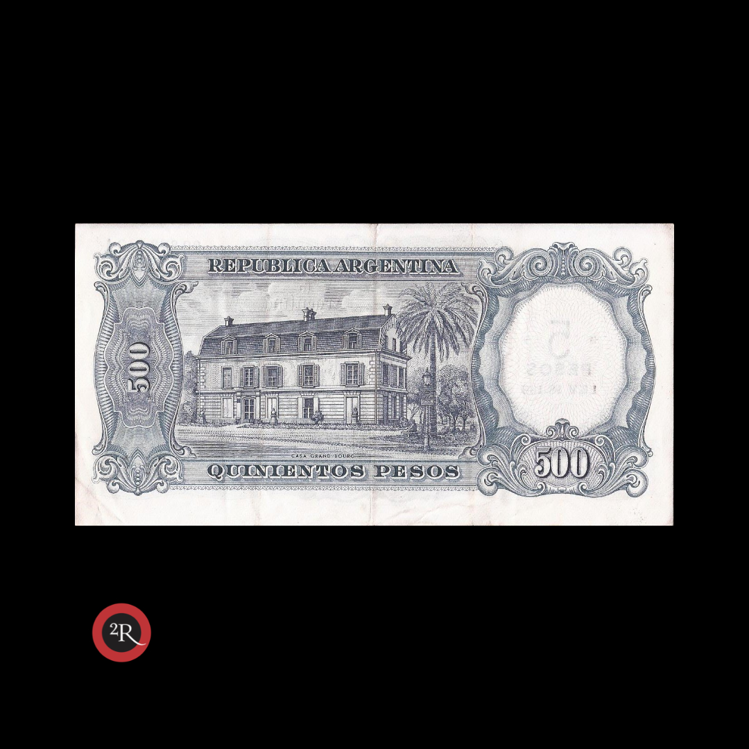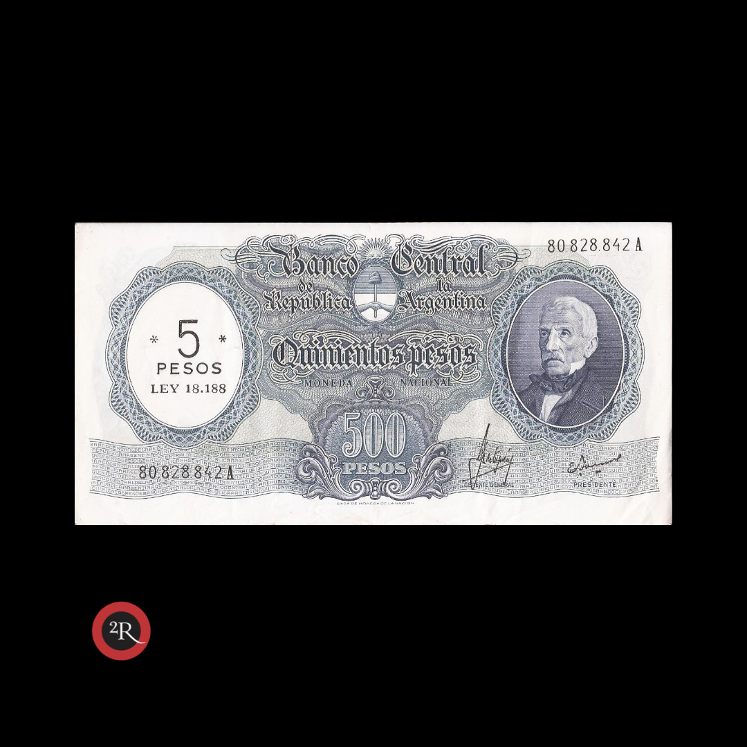 ARGENTINA 500 PESOS MONEDA NACIONAL RESELLADO A 5 PESOS LEY 18188 1969 BOT#2207 COL#553a